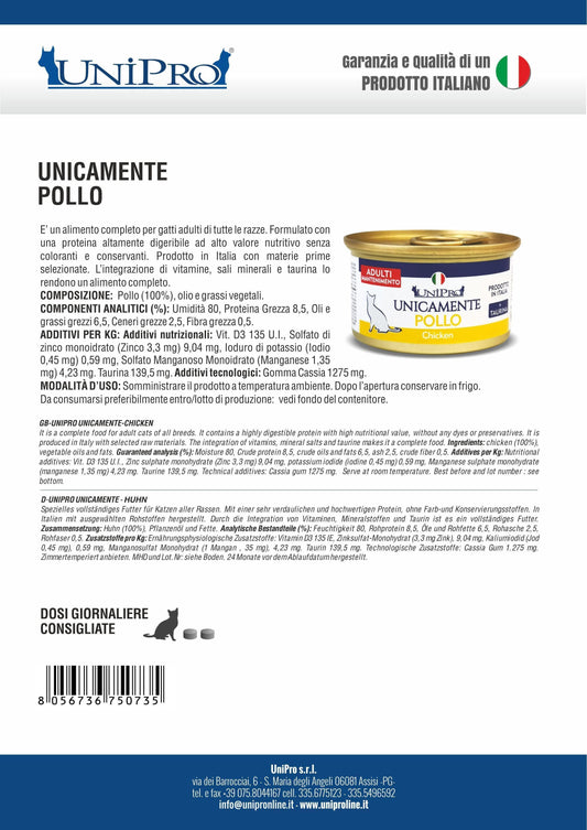 UMIDO PER GATTI MONOPROTEICO UNICAMENTE POLLO SENZA CEREALI 24 X 85 GR